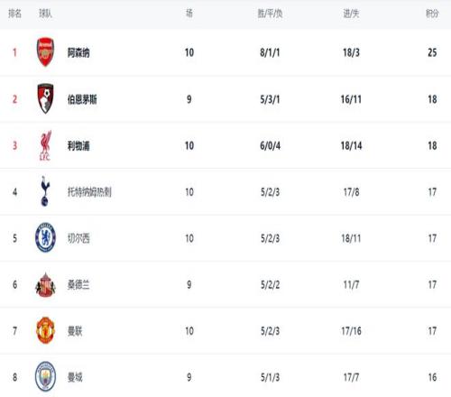 在积分榜上,阿森纳是独一档的存在,拿到25分排名榜首。伯恩茅斯这匹黑马以18分排第2。利物浦赢球之后,总积分也是达到18分,排名升到第3。热刺、切尔西、桑德兰和曼联这4支球队积分相同,都是17个积分。曼城踢了9轮,只拿到16分,排名第8。 |