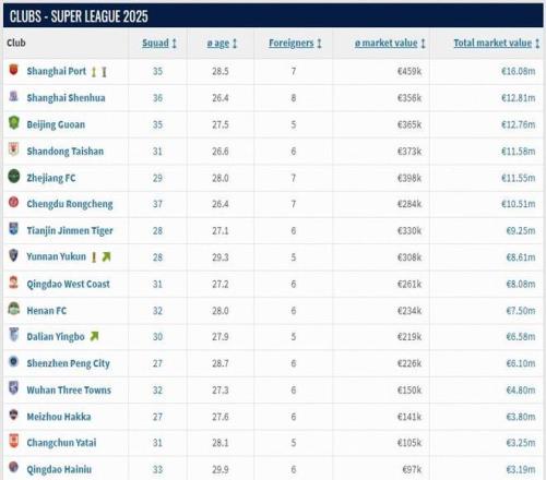 德转中超球队身价(2025赛季参赛球队)
